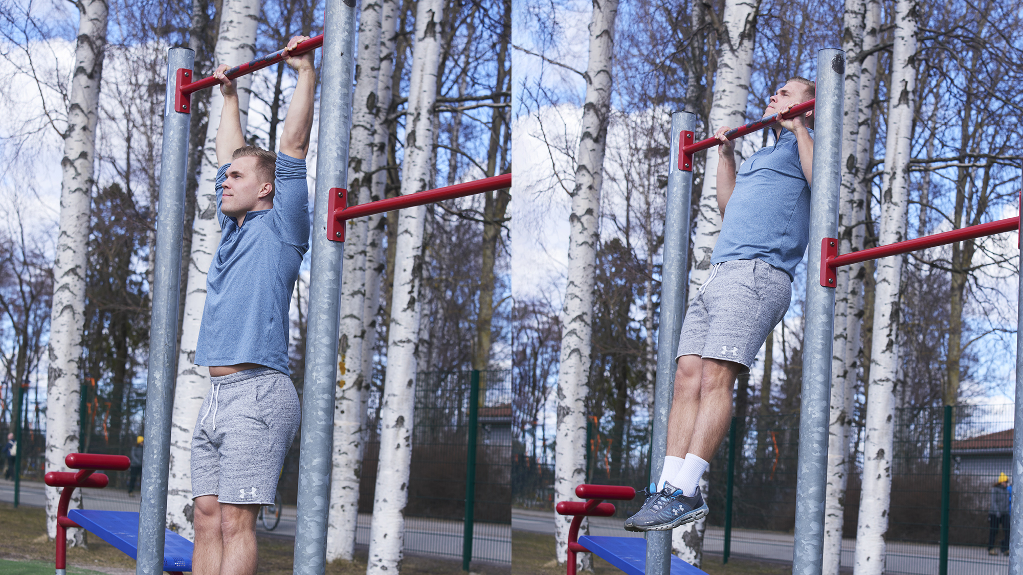 Asetu tankoon roikkumaan hieman hartioita leveämmällä myötäotteella. Peukalot osoittavat myötäotteessa sisäänpäin. Lähde vetämään hartioita napakasti alaspäin, jonka jälkeen lähde koukistamaan käsiä. Vedä leuka jokaisella toistolla tangon yläpuolelle.