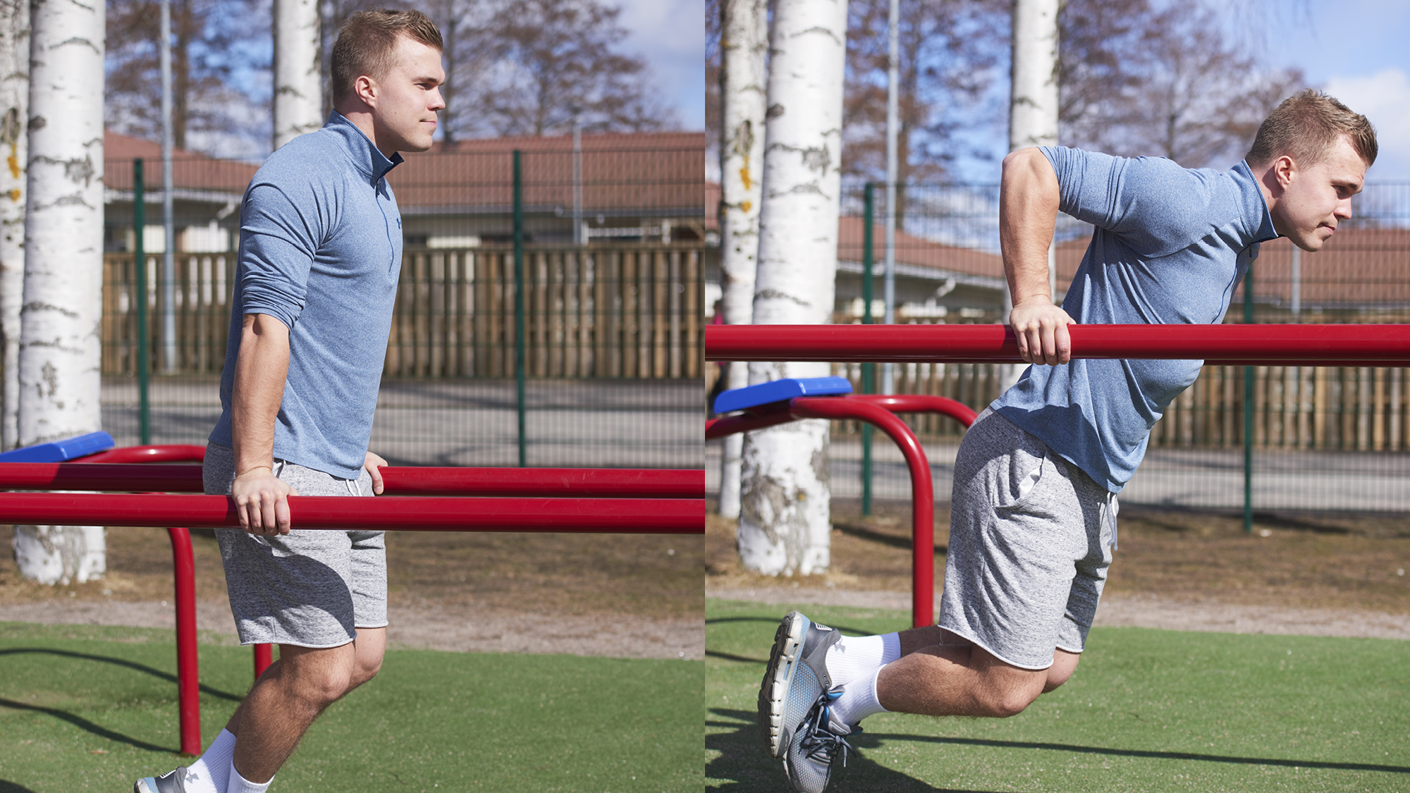 Ponnista ala-asennosta terävästi ylöspäin. Voit keventää liikettä vetämällä itseäsi ylöspäin kädellä, jolla pidät tangosta kiinni. Voit suorittaa liikkeen myös tekemällä yhdellä jalalla vain liikkeen jarruttavan eli laskeutuvan vaiheen. Liike suoritetaan muuten samalla tavalla, mutta ala-asennosta noustaan aina kahdella jalalla ylös.
