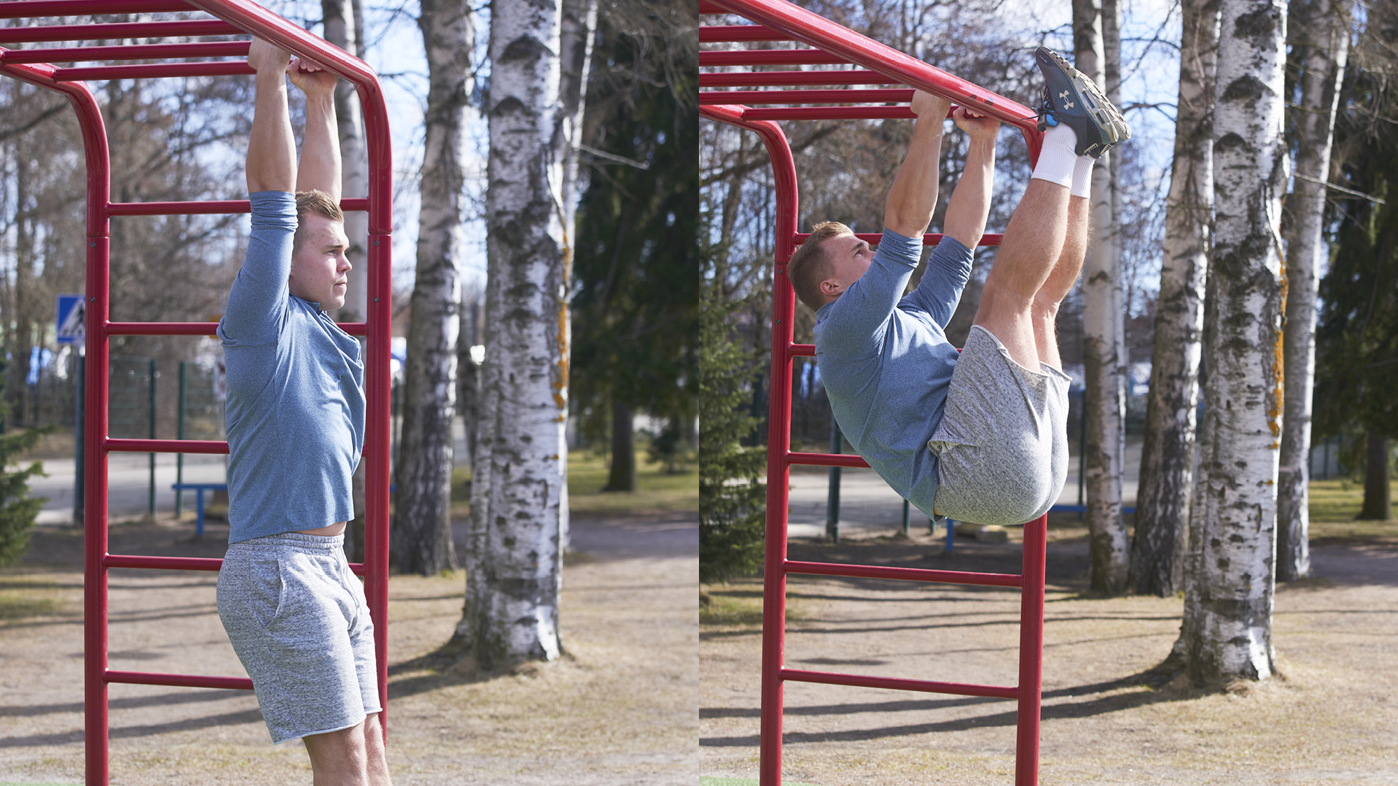 Asetu tankoon roikkumaan hieman hartioita leveämmällä myötäotteella. Paina hartiat kevyesti alas, jolloin yläselkä aktivoituu ja tukee liikkeen suorittamista. Lähde seuraavaksi nostamaan jalkoja joko suorana (haastavampi tapa) tai koukussa (kevyempi tapa) ylöspäin. Nosta jalat niin ylös kuin mahdollista ja laske ne rauhallisesti jarruttaen alas.
