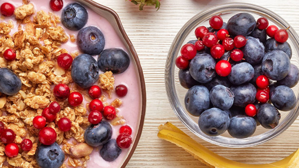 Iltapäivän välipala: Jogurttia, pähkinöitä ja hedelmiä.