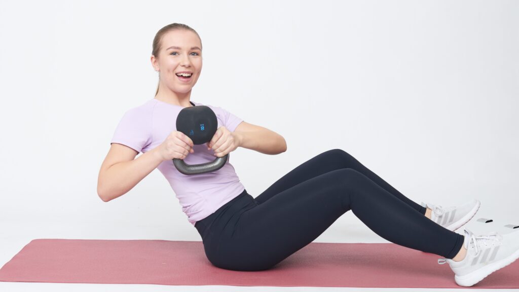 Istu polvet koukussa, ota molemmilla käsillä kahvan tyvistä kiinni ja nosta kuula rinnan eteen. Kuulan pohja osoittaa ylöspäin. Nojaa pienesti taaksepäin. Jos haluat liikkeeseen haastetta, voit nostaa jalat ilmaan.