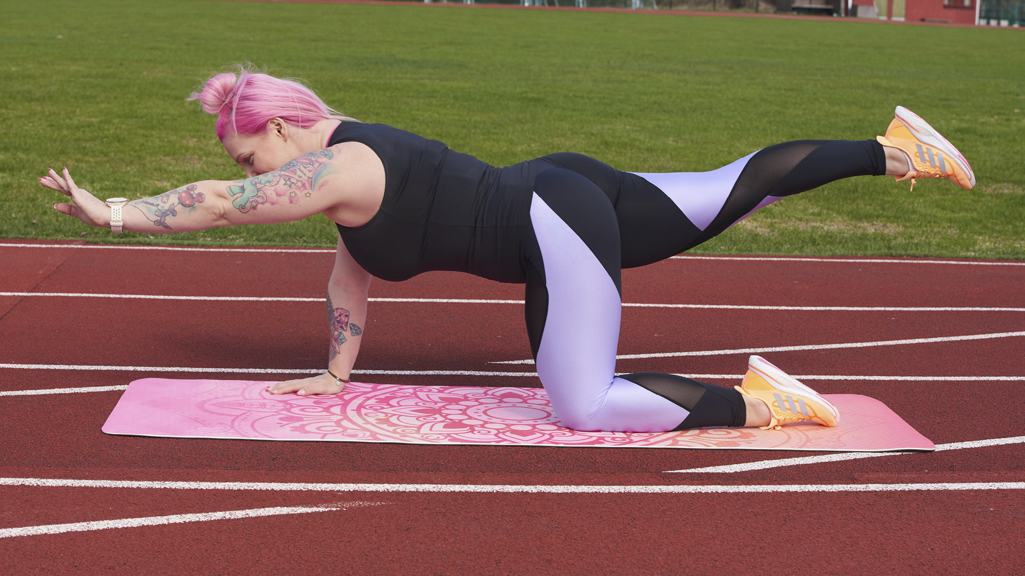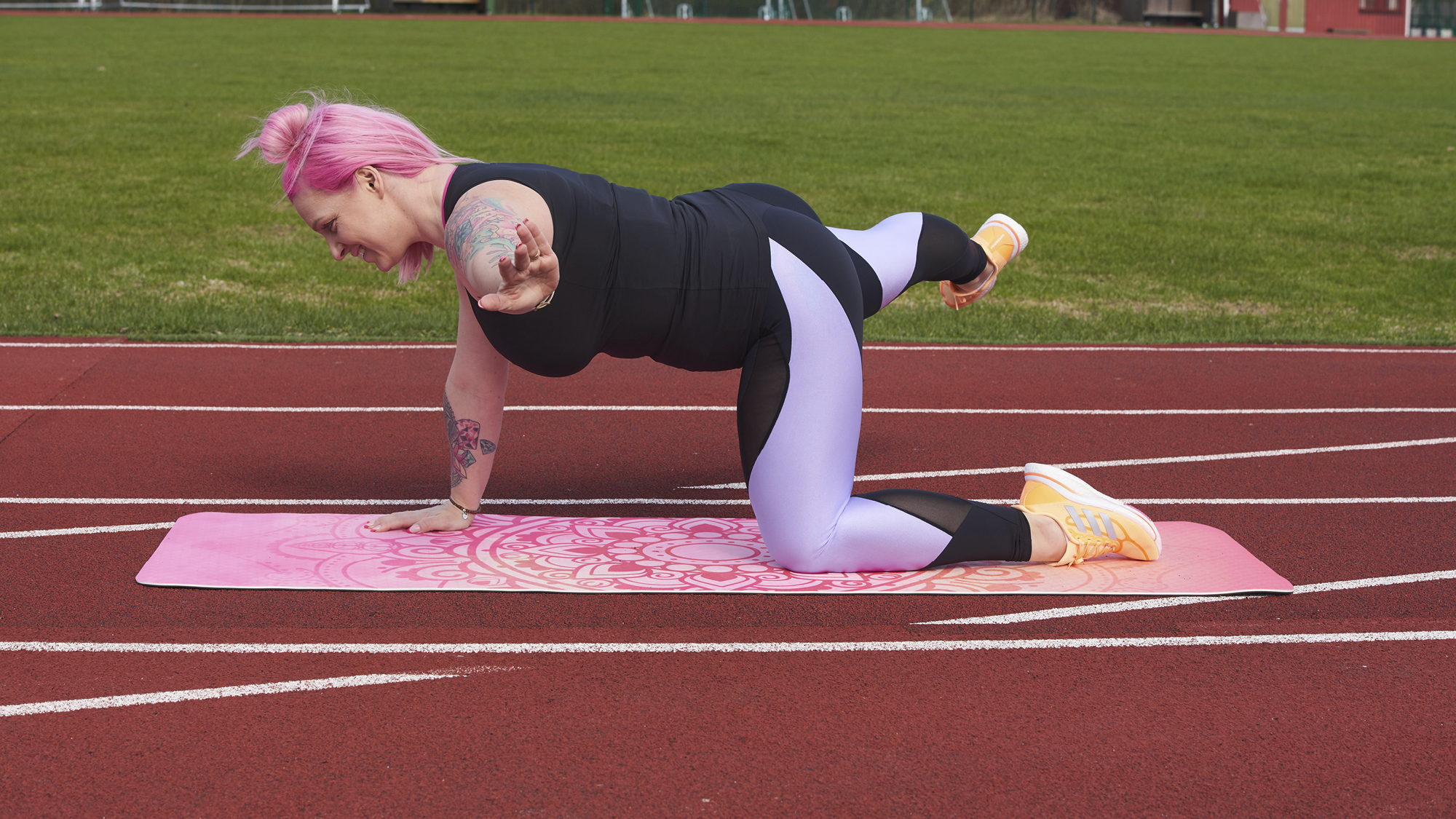 Käy konttausasentoon niin, että polvet asettuvat suoraan lonkan alapuolelle ja kädet suoraan olkapäiden alle. Aktivoi lapatuki ja jännitä keskivartalo tiukaksi. Lähde nostamaan vastakkaista jalkaa ja kättä ensin