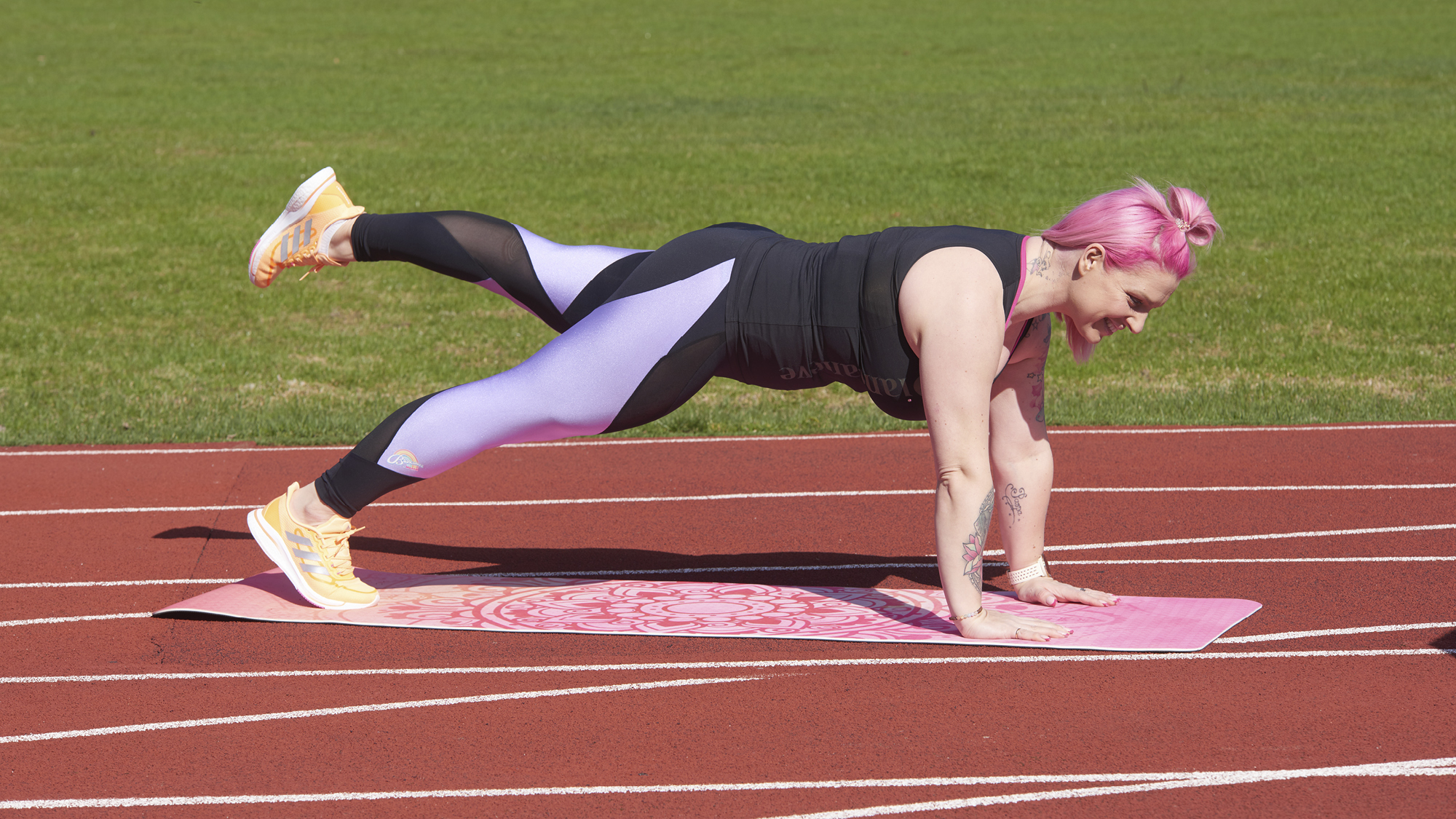 Käy punnerrusasentoon: jalat ovat hartioiden leveydellä ja varpaat kiinni alustassa. Olkavarret ovat suorina hartioiden alla ja kämmenet osoittavat suoraan eteenpäin. Jännitä keskivartalo tiukaksi. Pidä katse maassa niin, että niska pysyy koko ajan selkärangan suorana jatkeena. Lähde nostamaan jalkaa vuorotellen ylös. Pidä keskivartalossa hyvä tuki äläkä päästä lantiota tipahtamaan jalkaa nostaessasi.