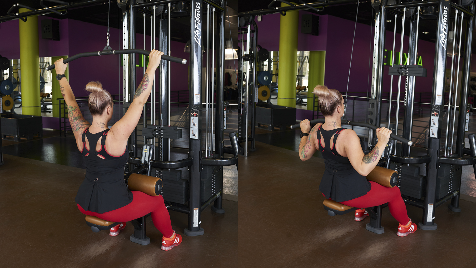 Ota hartioita leveämpi myötäote tangosta. Älä päästä hartioita korviin. Avaa selkää niin, että ylävaiheessa lapaluiden väliin tulee tilaa.