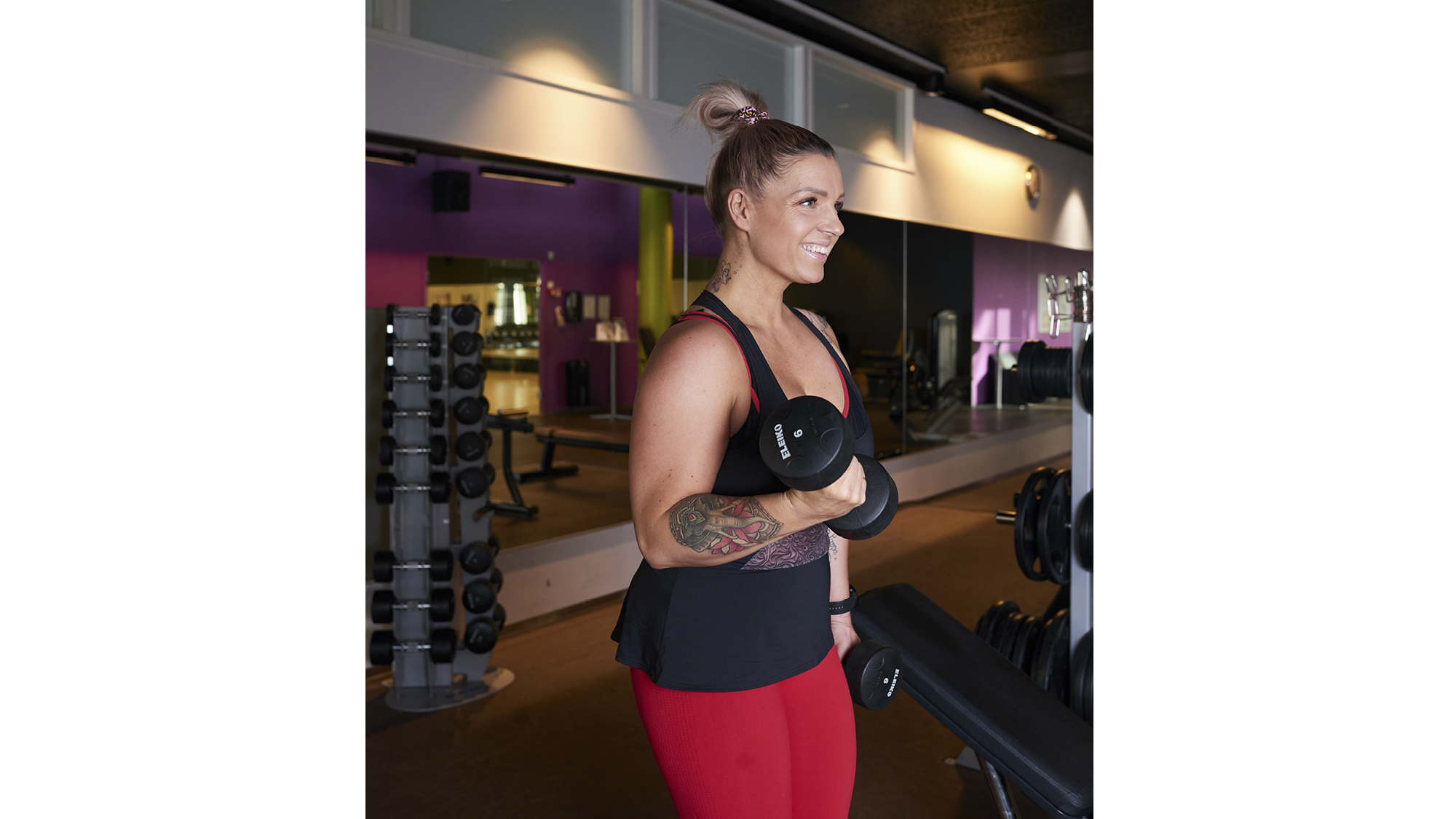 Ota käsipainot käsiisi. Laske kädet sivuille suoriksi niin, että rystyset osoittavat ulos sivuille. Lähde nostamaan vuorotellen kättä koukkuun. Nostaessasi painoa ylöspäin kierrä rystyset eteen, ja laskiessasi painoa alaspäin kierrä rystyset takaisin sivuille.