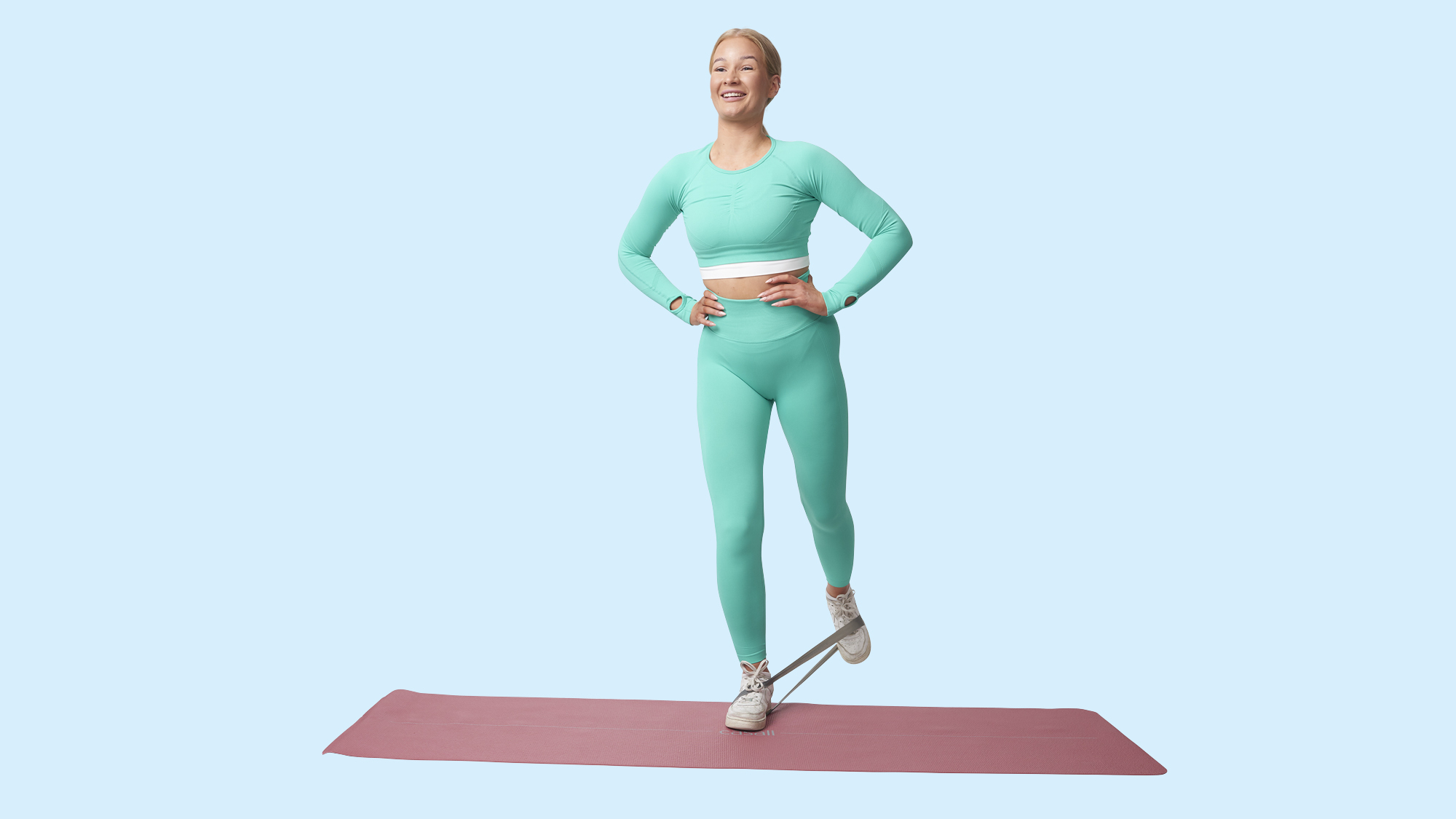 Pidä kuminauha nilkkojen ympärillä. Koukista taas tukijalan polvi ja jännitä keskivartalon lihakset. Nosta toinen jalka suorana sivulle ja jarruta liike alas.