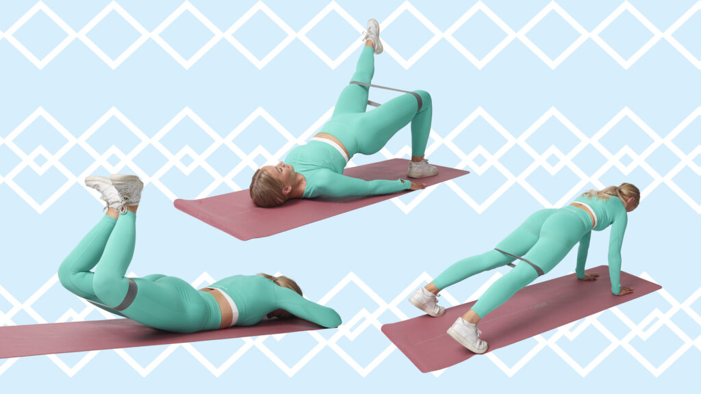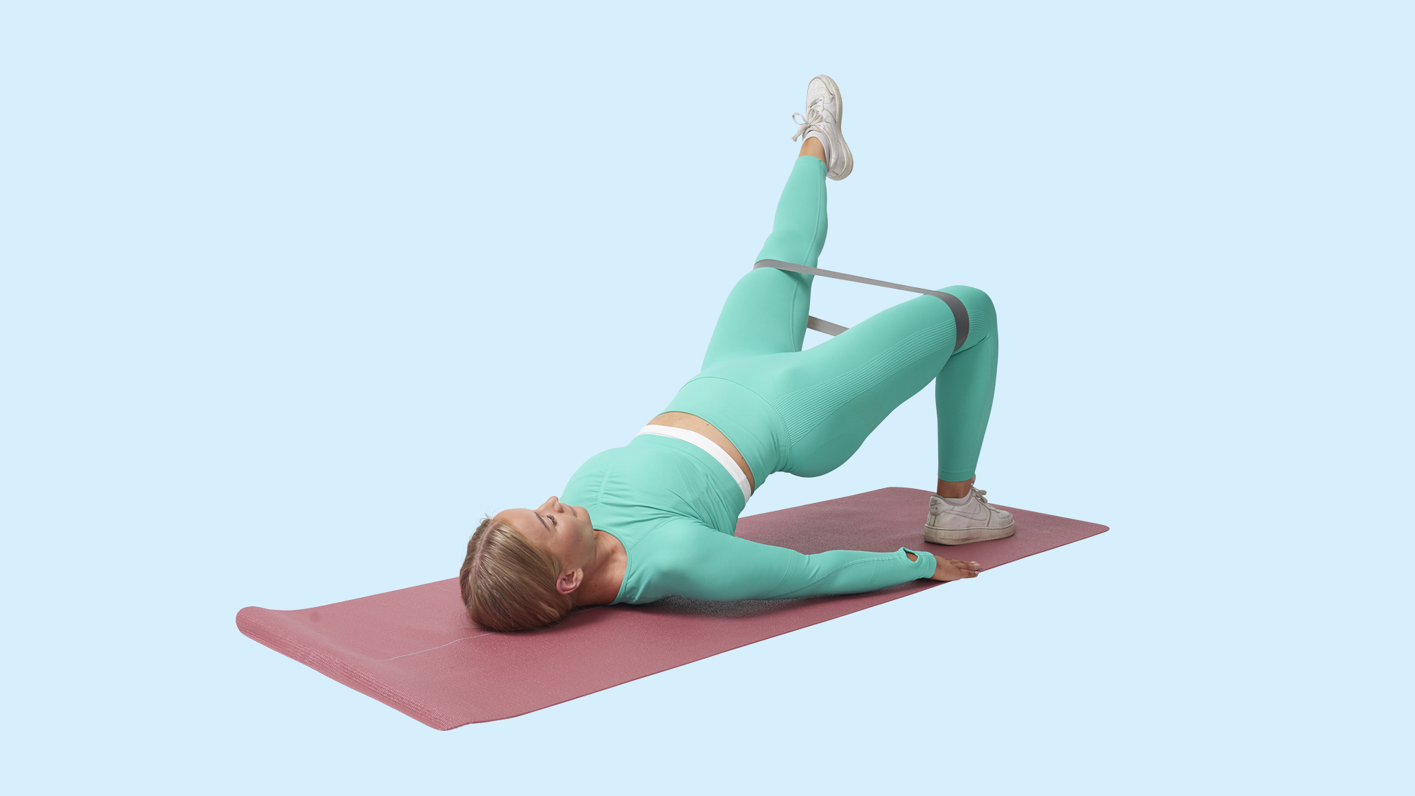 Käy selinmakuulle ja aseta kuminauha jalkojen ympärille, hieman polvien yläpuolella. Tuo jalkapohjat lähelle pakaroita ja nosta lantio mahdollisimman ylös. Paina hartiat kunnolla alustaan ja aktivoi keskivartalon lihaksisto. Työnnä polvia ulospäin ja palauta ne hitaasti aloitusasentoon. Pidä pakarat koko ajan jännitettyinä ja lantio paikoillaan. Lisää haastetta saat, kun nostat yläasennossa toisen jalan hetkeksi ylös.