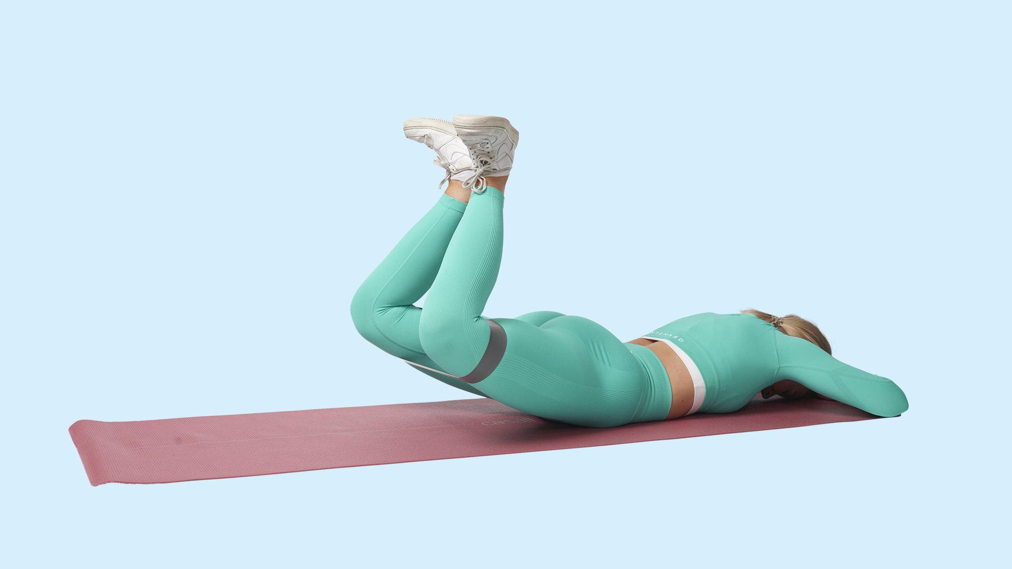 Pidä kuminauha edelleen polvien yläpuolella, mutta käänny päinmakuulle. Tuo sormet otsan alle ja anna pään levätä käsien päällä. Koukista polvet ja nosta jalkapohjat katon suuntaisiksi. Tuo kantapäät lähelle toisiaan. Nosta reidet irti lattiasta. Pidä kantapäät yhdessä, mutta työnnä polvet kauas toisistaan. Palauta reidet hitaasti alustaan ja toista uudelleen.