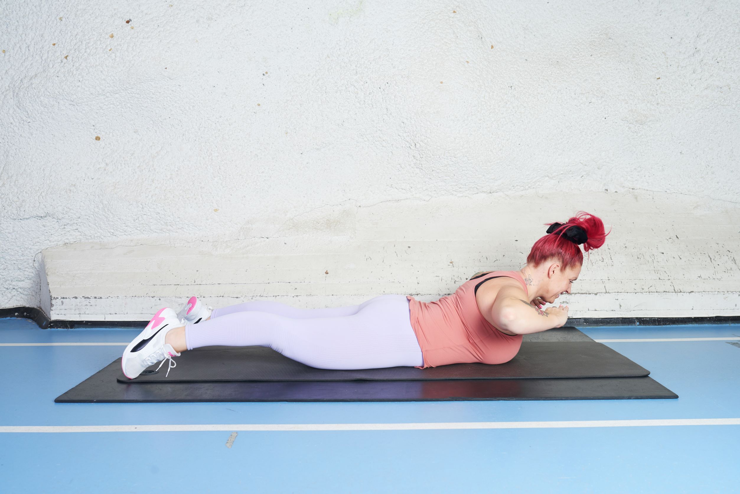 Laskeudu kyynärnojaan, pidä myös siellä huolta, että lapaluiden väli pysyy pyöreänä ja lantio hieman hartioita alempana.