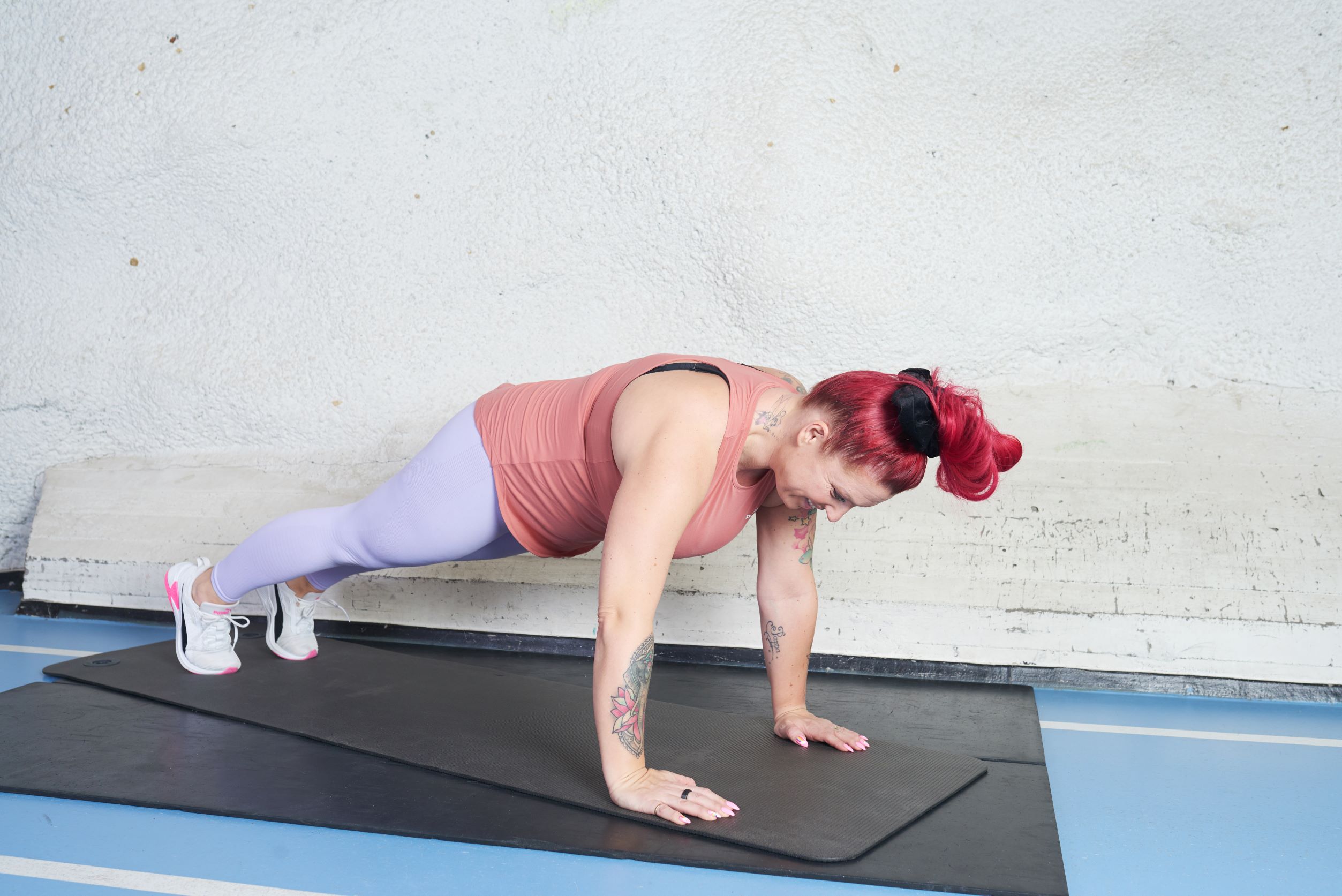 Asetu punnerrusasentoon. Kädet suoraan olkapäiden alapuolella. Pidä huoli, että lapaluiden väli on pyöreä ja lantio hieman hartioita alempana.