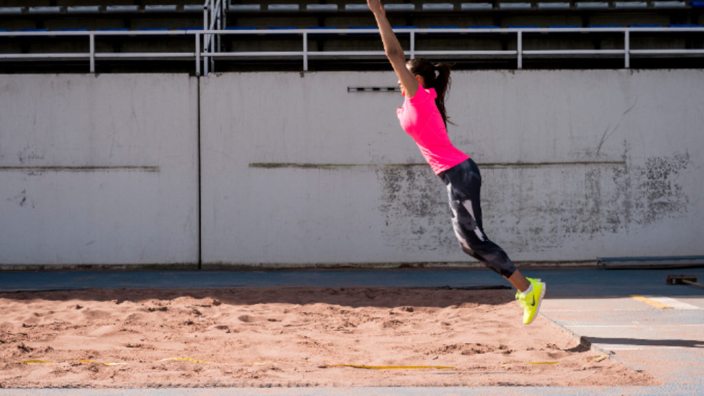 - Asetu hiekkalaatikon reunalle, varpaat ovat hieman reunan yli. Kyykisty alas ja ponnista tehokkaasti eteenpäin käsiä samalla eteen heilauttaen.