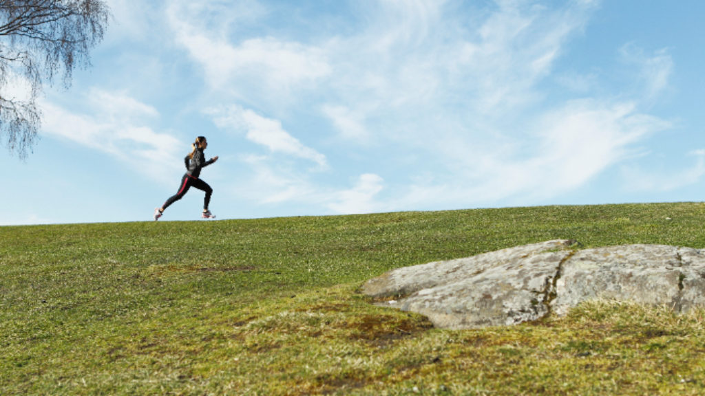Kun juoksulenkillä tulee ylämäki vastaan, on mainio HIITin paikka. Juokse 10–30 sekuntia täysillä ja palauttele alas kävellen. Lyhennä hieman askelta ja pidä ylävartalo linjassa jalkojen päällä, kun juokset ylämäkeen.