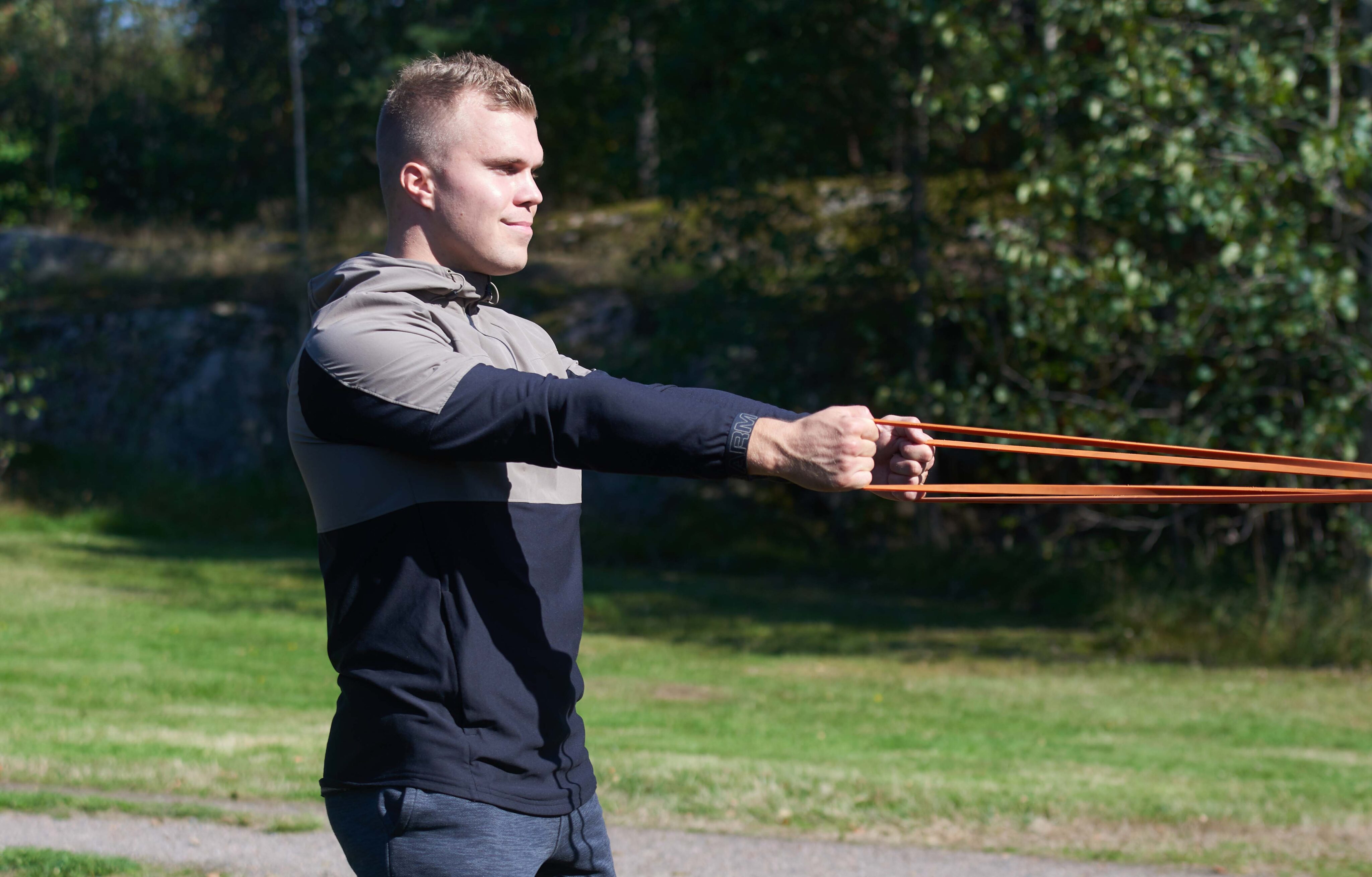 Vie kädet suoriksi eteesi. Kuminauha on sellaisella etäisyydeltä, että tunnet kevyen vastuksen. Lähde vetämään hartioita ja kyynärpäitä taaksepäin. Lisää liikkeeseen ulkokierto niin, että ryhdyt kääntämään rystysiä taaksepäin eli kohti selkää.