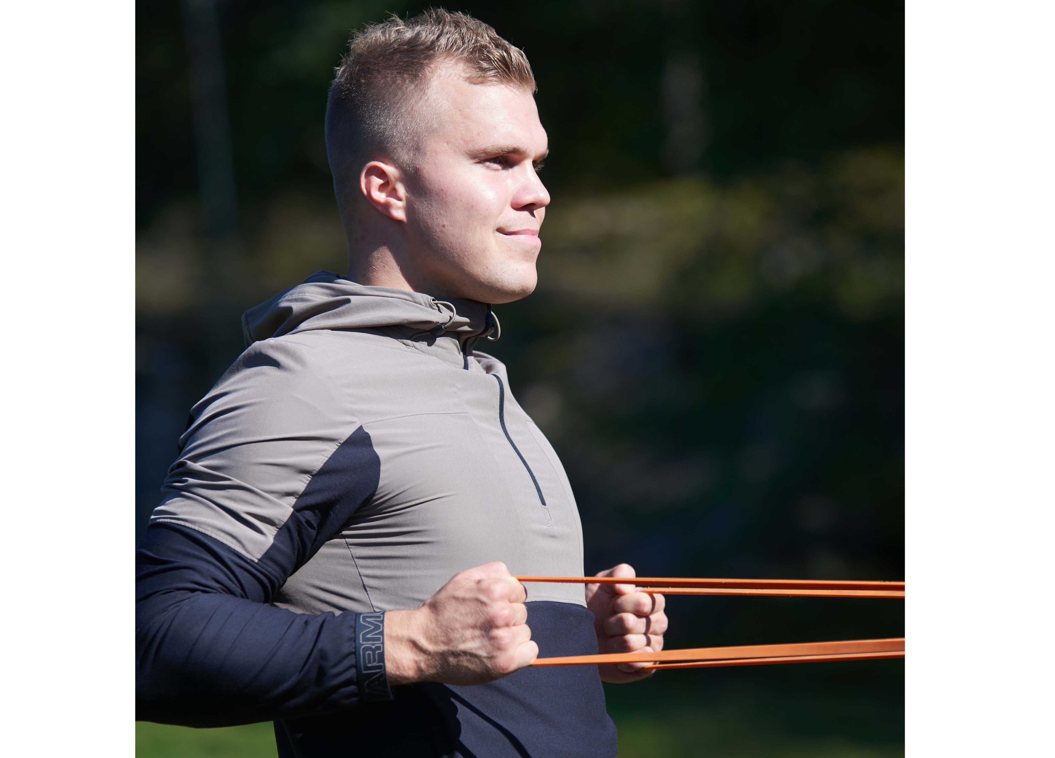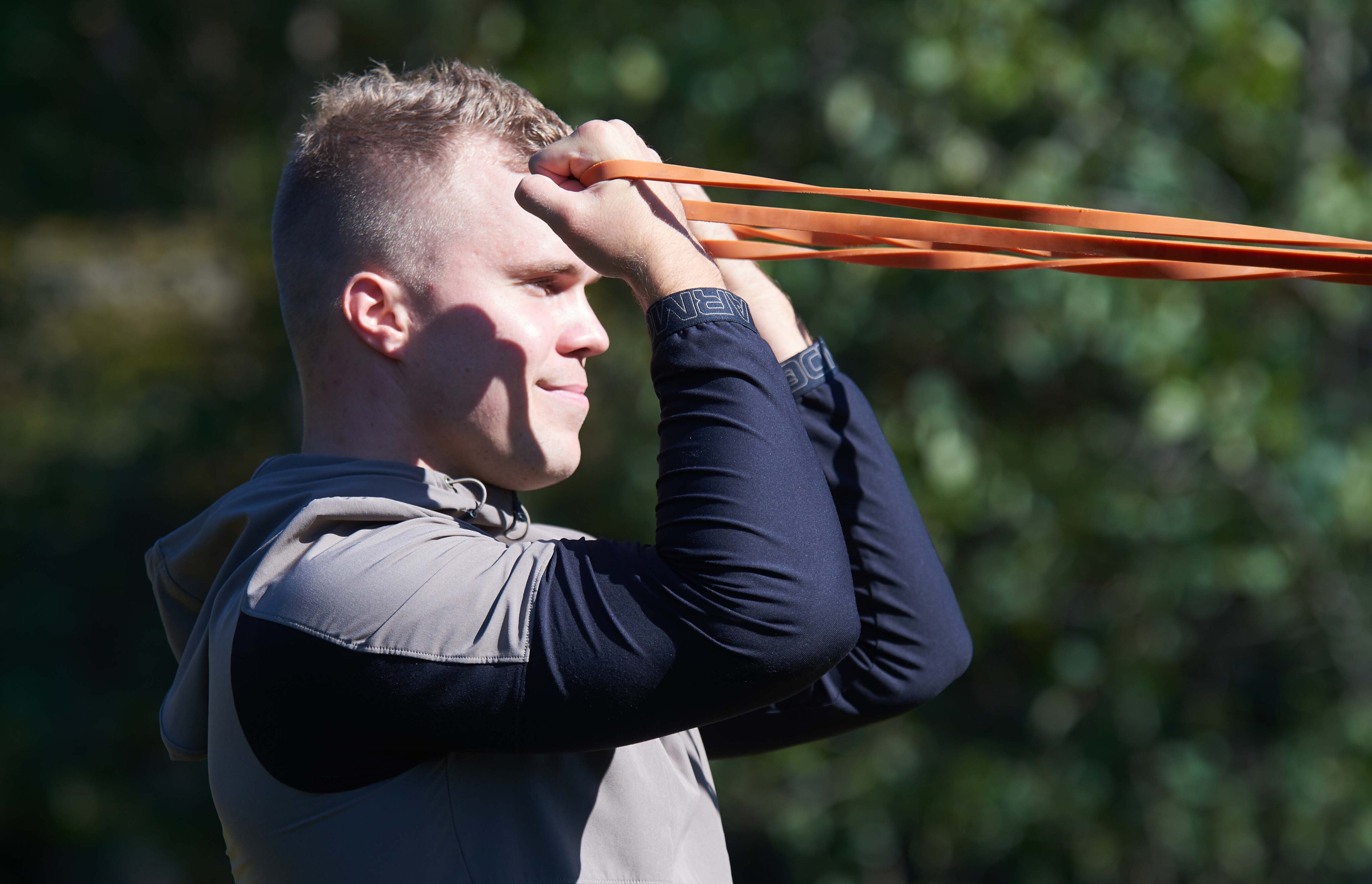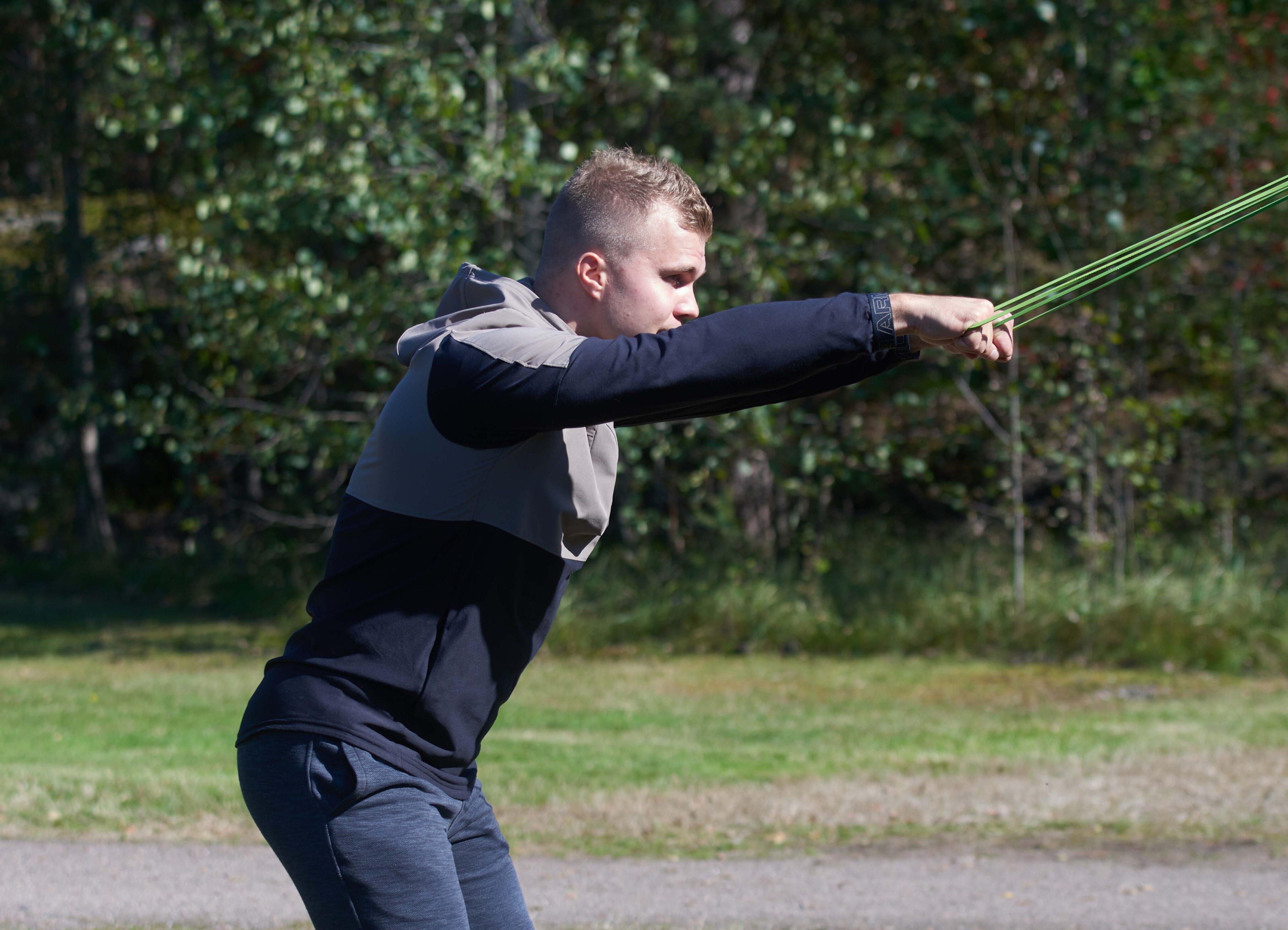 Kiinnitä kuminauha olkapäiden tasolle ja asetu sopivalle etäisyydelle. Aloita suoritus kädet suorina