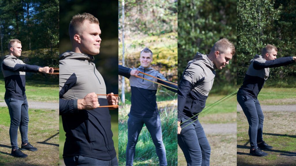 Kiinnitä kuminauha olkapäiden tasolle ja asetu sopivalle etäisyydelle. Aloita suoritus kädet suorina