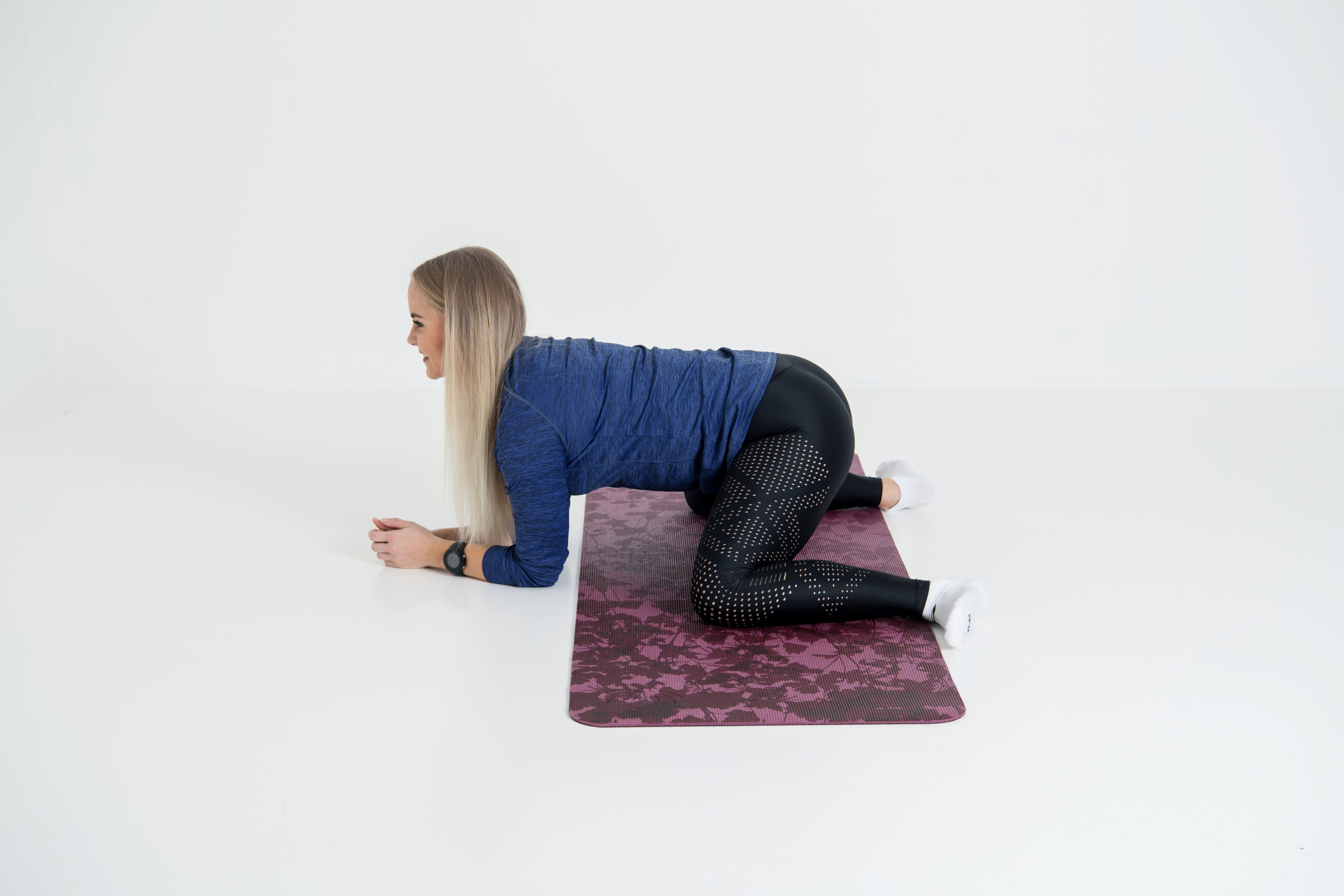 Asetu polvien ja kyynärvarsien varaan. Levitä polvet mahdollisimman leveälle. Aktivoi vatsalihakset kääntämällä lantiota alle, jolloin alaselkä ei ole notkolla. Tarkista, että nilkat ovat suoraan polvien takana ja vedä nilkat voimakkaasti koukkuun. Työnnä lantio niin pitkälle taakse, kunnes tunnet venytyksen reisien sisäsyrjissä ja lonkkien alueella.