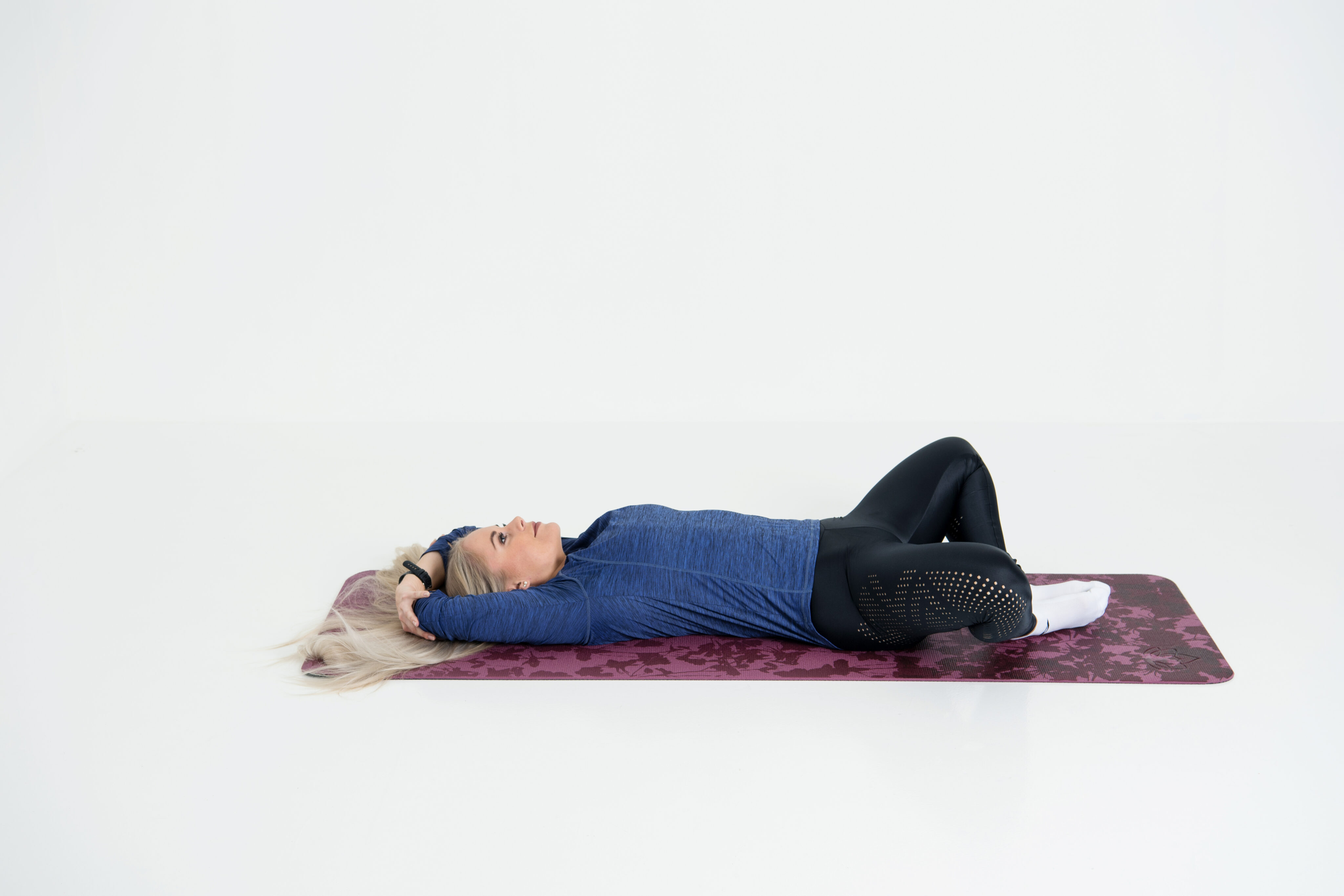 Käy makoilemaan selällesi. Tuo jalkapohjat yhteen ja laske ne lattiaan lähelle pakaroita. Ohjaa polvia kohti lattiaa. Nappaa ote vastakkaisista kyynärtaipeista ja vie kädet pään yli lattiaa kohti. Rentouta hartiat ja anna alaselän pehmetä. Nauti ja anna painovoiman tehdä työ puolestasi.