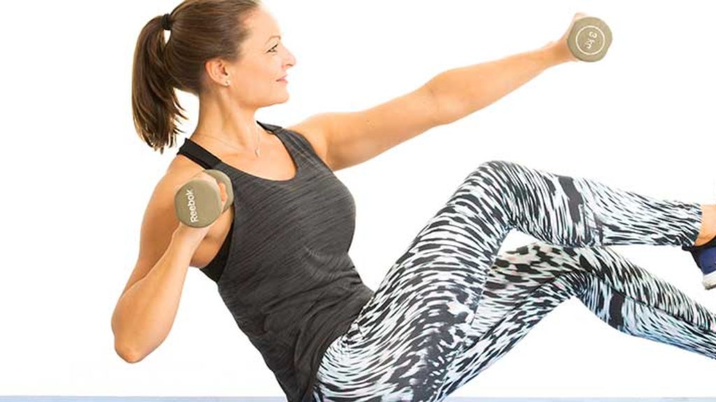 ➤ Käy matolle selinmakuulle. Tuo jalkapohjat lattiaan ja polvet koukkuun. Ota käsipainot ja nosta ne olkapäiden eteen.