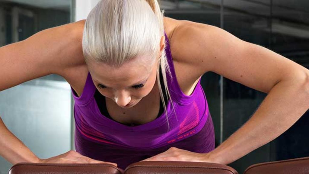 ● Punnerra tanko suorille käsille. Vedä hartioita alas kohti lantiota koko liikkeen ajan, jolloin saat lisätehoa liikkeeseen, muttet rasita turhaan niveliä.