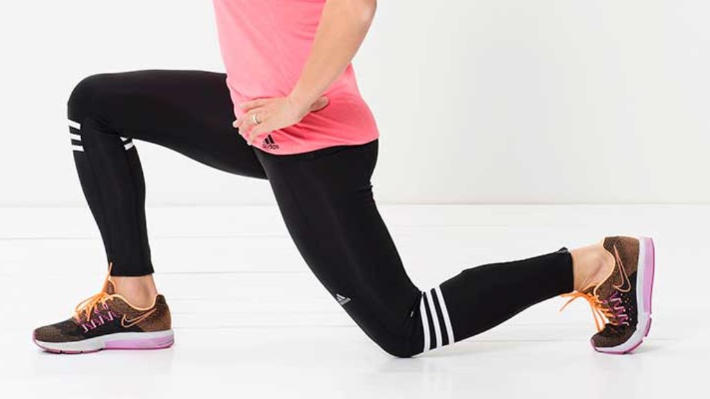 ● Muista hyvä ryhti ja aktiiviset vatsalihakset. Tuo takana olevan jalan polvea mahdollisimman lähelle lattiaa. Varmista, että polvi ja jalkaterä kulkevat samassa linjassa.