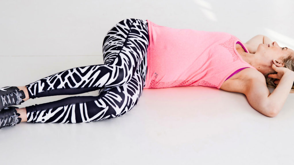 Asetu kylkimakuulle jalat reilusti koukussa, kädet niskan takana. ➤ Kierrä päällimmäistä kyynärpäätä auki. Rintakehä ja pää kiertyvät, alenpi kyynärpää jää alustaan. ➤ Pidä lantio paikallaan ja vie liike vain siihen asti, mikä tuntuu hyvältä. ➤ Tee toistot ja vaihda puolta.