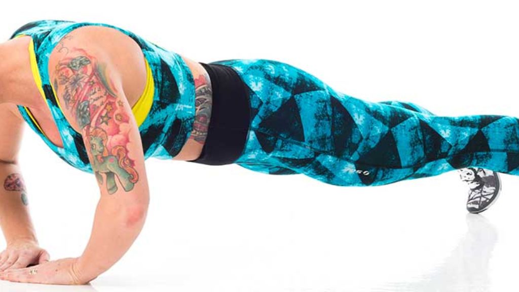 ● Pidä ote hartioita reilusti kapeampana, niska suorana ja kämmenet lattiassa. Kyynärpäät ovat hieman pehmeät. Nosta toinen jalka suorana irti lattiasta.