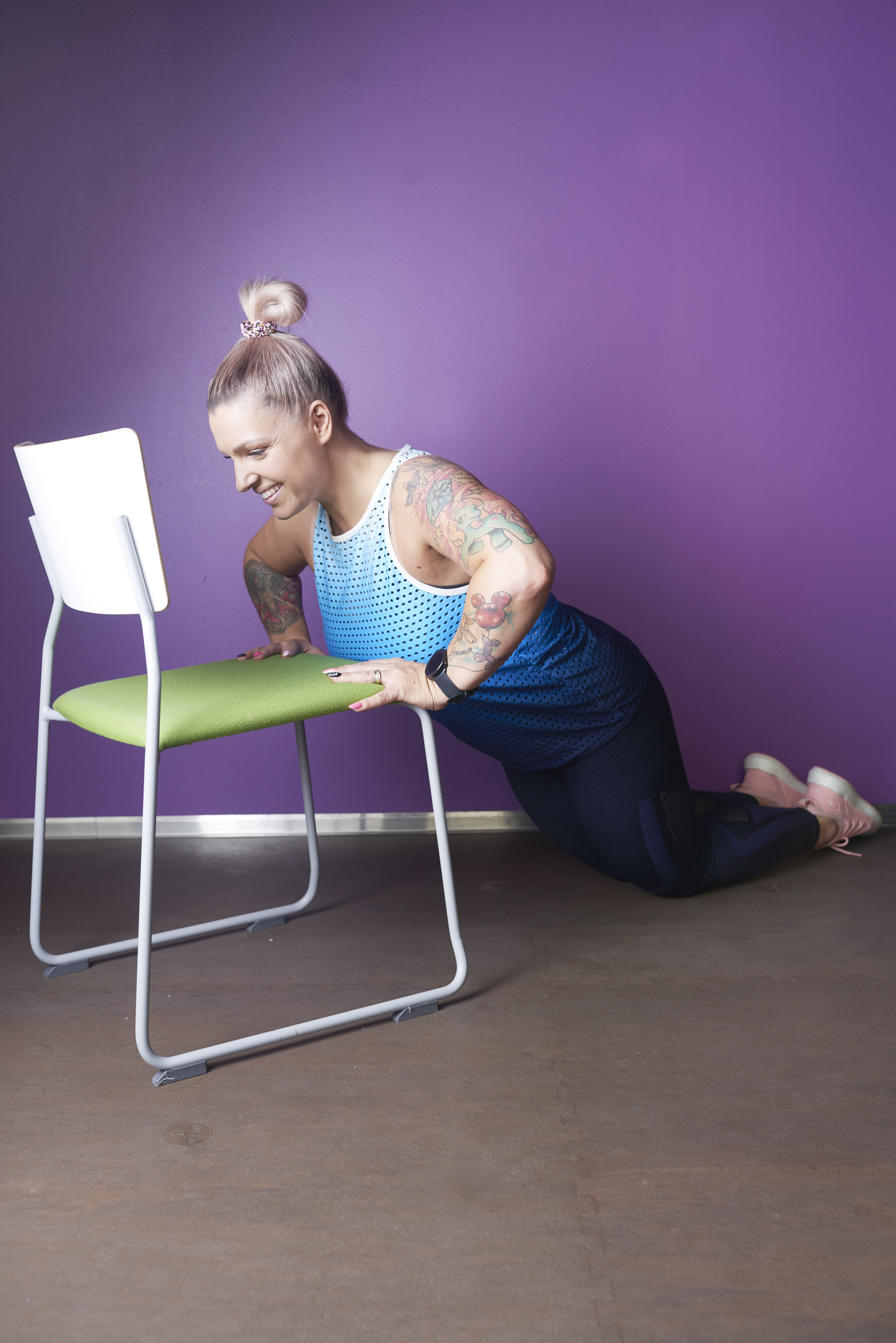 Asetu selin tuolia päin. Ota istuimen reunasta kiinni käsillä ja laskeudu tuolin viereen istumaan niin, että kädet pitävät sinua pystyssä. Pidä kyynärpäät koko ajan mahdollisimman kapealla toisistaan ja niin, että ne osoittavat taaksepäin, eivät sivuille. Lähde viemään peppua alaspäin, samalla kyynärpäitä koukistaen. Työnnä sitten käden suoriksi. Muista pitää keskivartalo tiukkana, ettei selkä pääse pyöristymään.