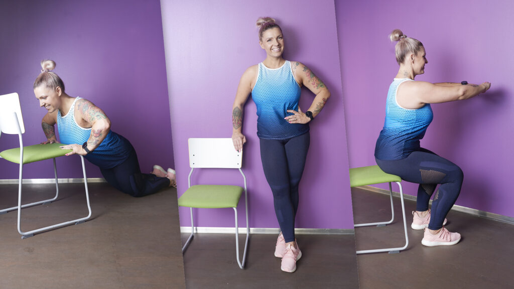 Monna Pursiaisen suunnittelema tuolijumppa on tehokas tapa keskeyttää työnteko ja antaa lihaksille töitä. Raivaa hieman tilaa ja nosta peppu työtuolilta ylös!