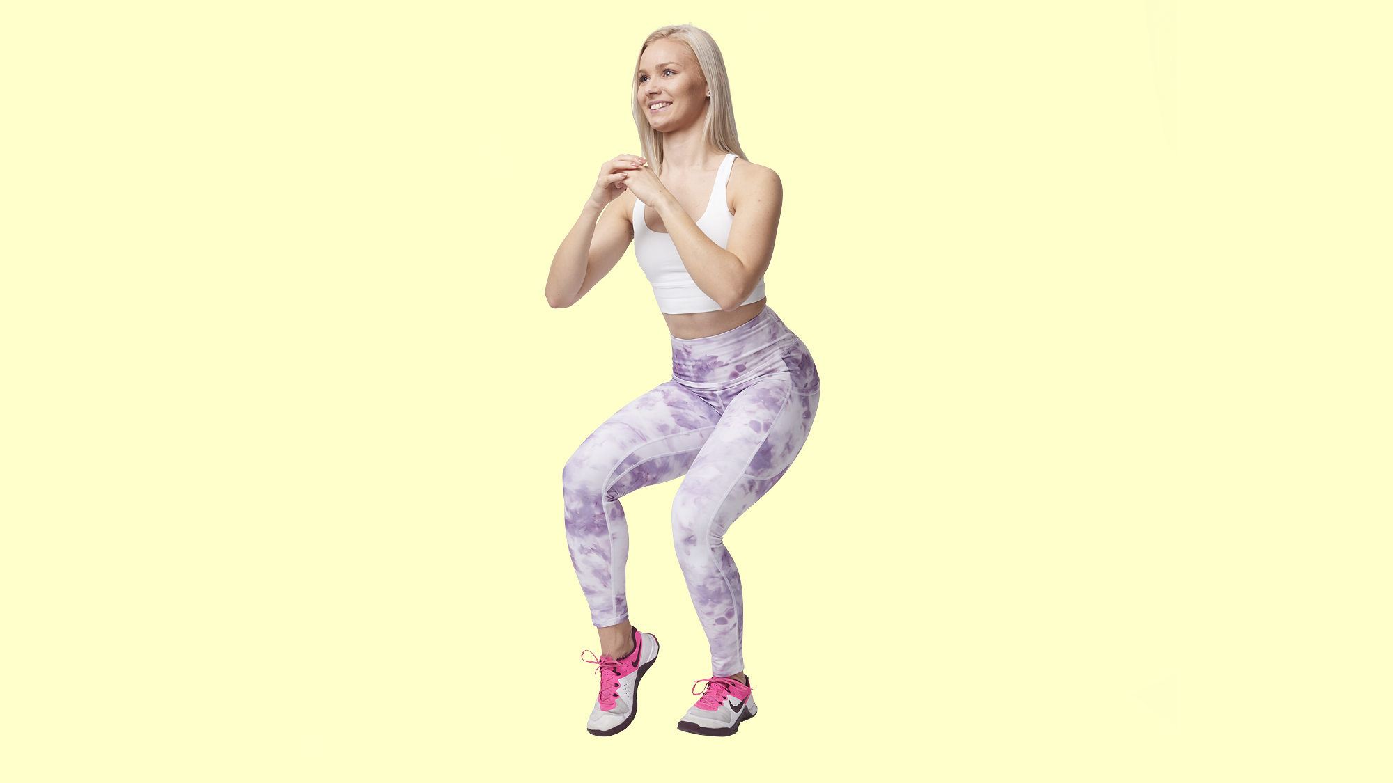 Nyt kyykätään jalkoihin jytyä kotosalla. Kun pakarat ja reidet vahvistuvat, jalkatreeni muuttuu helpommaksi, juoksu kulkee ja portaiden kapuaminen helpottuu.