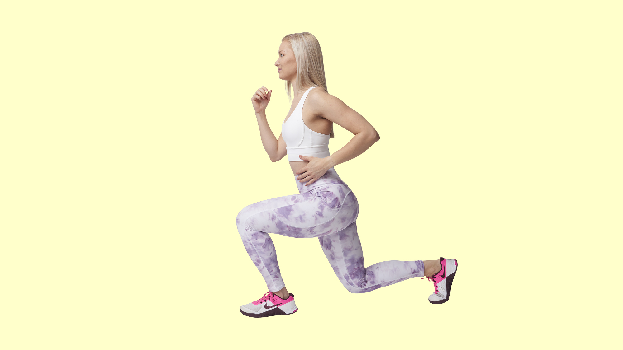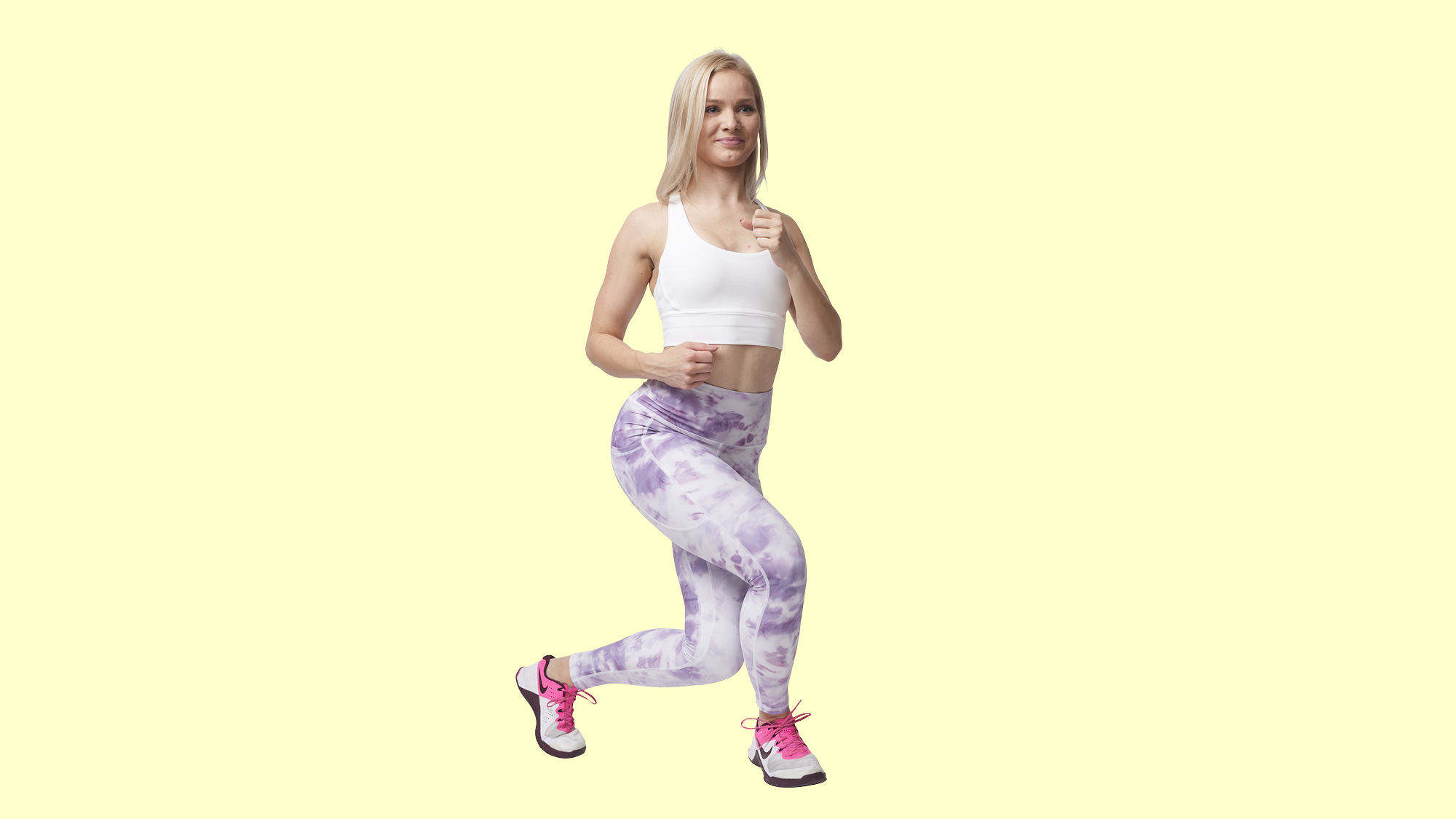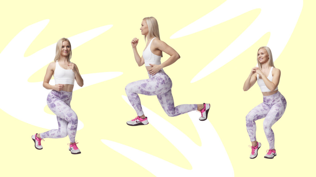 Askelkyykyn variaatio haastaa jalkojen ja pakaroiden lisäksi myös keskivartaloa ja tasapainoa.