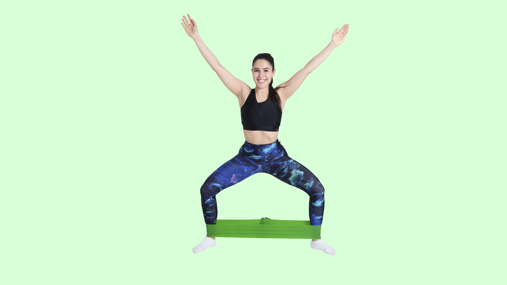 Pujota kuminauha jalkojen ympärille ja aseta se hieman nilkkojen yläpuolelle. Laskeudu puolikkaaseen kyykkyyn. Hyppää jalat auki. Työnnä samalla polvia voimakkaasti auki, jotta pakarat aktivoituvat ja liike on polvinivelille turvallinen. Hyppää sitten jalat takaisin yhteen ja toista uudelleen. Pidä selkä suorana ja rinta ylhäällä. Pidä kantapäät koko ajan lattiassa, ja polvet samassa linjassa varpaiden kanssa.