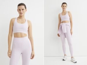 H&M:n sporttiliivit lupaavat maksimaalista tukea ja istuvuutta säädettävillä olkaimilla. Myös urheiluliivien materiaali on 79 prosenttisesti kierrätettyä polyesteriä. Värivaihtoehtoina ovat treenihousuihin sopivan vaaleanliilan lisäksi valkoinen, fuksia, vaaleansininen ja luonnonvalkoinen. Kokohaarukka on XS–XL.