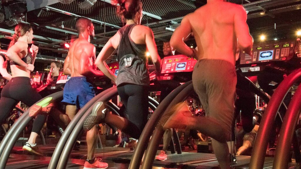 Pakkaudumme kiinni oveen, jonka toiselta puolelta kuuluu huumaava basso ja kovia huutoja. ”Come on!”, “This is it!”, ohjaaja kannustaa. Olo on kuin jonotettaisiin kaupungin kuumimpaan klubiin, vaikka odotammekin vuoroamme päästä kuntoilemaan.